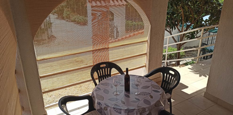Apartman A5 koristi veliku terasu koju dijeli s Apartmanom A4 kojeg koriste domaćini. Stol i stolice su od 2023. godine novi (no nismo fotografirali). Prednost je što domaćini tijekom dana ne koriste terasu već povremeno iza 21 h navečer. U slučaju da želite izdvojenu terasu, savjetujemo vam apartmane 2, 3 i 6. Na raspolaganju vam je i veliki roštilj koji je za sve naše goste koji se nalazi s druge strane kuće.